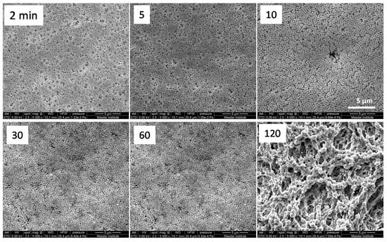 Figure 6. Surface SEM images of membrane samples prepared at different exposure times under 60% RH, 12% w/w PVDF concentration and 500-μm casting thickness. All images have the same scale bar, shown in the top-right image.