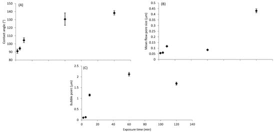 Figure 7. Impact of exposure time on (A) CA (contact angle); (B) MPS (mean flow pore size) and (C) BP (bubble-point pore size), for membranes prepared under RH of 60% and at casting thickness of 500 μm with 12% w/w PVDF concentration.