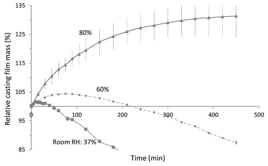 Figure 8 shows mass variation of polymer cast film during exposure to different humidity values (37%, 60% and 80% RH). In all cases, soon after the exposure started, the film mass started to increase until it reached a maximum value, and then it decreased. As the RH increased, a shift in the maximum uptake was observed, peaking at around 20, 90 and 450 min for 37%, 60% and 80% RH, respectively. The rate of moisture uptake before reaching the maximum value was also faster for higher RH. Two competing mass transfer phenomena in the cast film are expected during the exposure: (1) the water flows into the film due to the hygroscopic and miscible nature of water and DMAC; and (2) the outflow of DMAC and water from the cast film. Before reaching the maximum mass, water uptake was a predominant phenomenon, leading to an increase in mass of the cast film. The increase in absorption rate of water at higher RH was a result of a larger chemical potential at higher water concentration in air. After reaching the maximum value, solvent and water evaporation from the casted film prevailed over water sorption, resulting in a weight loss. The water sorption stopped when there was no chemical potential difference, which occurred when the amount of water on the cast film was large enough. The loss of mass then continued as a result of the concomitant DMAC and water loss from the film.