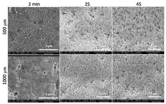 Figure 9. Surface SEM images of PVDF membranes prepared using VIPS process at different casting thicknesses and exposure times, all using 12% w/w PVDF polymer solution and under 80% RH.