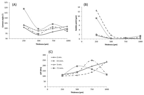 Figure 10. Impact of casting thickness on the properties of PVDF membrane prepared using VIPS process, all using 12% w/w PVDF polymer solution and under 80% RH. (A) Contact angle profile; (B) Bubble point profile; (C) LEP profile.