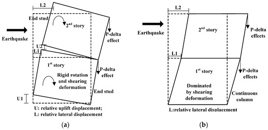 Deformation diagram of CFS shear wall systems under earthquakes (a two-story shear wall system is chosen as an example). (a) Traditional type. Reproduced with permission from [6], American Society of Civil Engineers, 2013; (b) reinforced type.