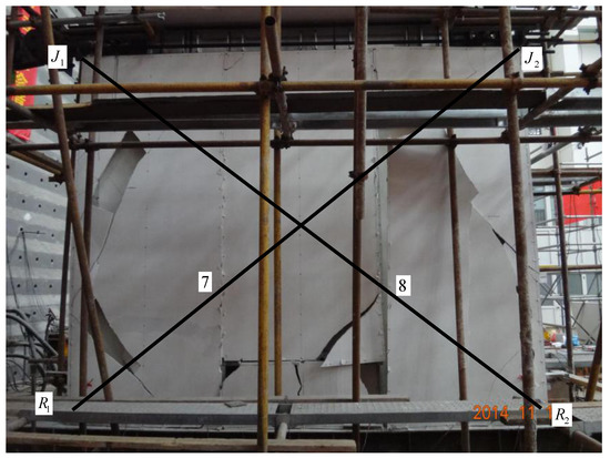 Figure 12 and Figure 13 show the experimental behavior of specimen W2. It was observed that the behavior of the sheathings on both sides was identical to that of specimen W1. The rotation of the concrete-filled end stud bases cannot be effectively restrained because local buckling of the studs occurred in the vicinity of joints R1 and R2, as shown in Figure 13a,b. As such, the structure essentially loses or weakens its rigid connections with the foundation. Local buckling also appeared in the bottom end studs on top (at joints J1 and J2) (see Figure 13c,d). After the sheathing demolition, as shown in Figure 13e,f, the end studs basically lose their rigid connections with joints J1 and J2, because those joints can no longer effectively restrain the rotation of the studs. The loading procedure was terminated before the specimen reached its total collapse with the same purpose as that of specimen W1. Nevertheless, as shown in Figure 12 and Figure 13, the total collapse tendency and failure mechanism of the collapse of specimen W2 are similar to those of specimen W1, as a result of the rigid connection’s loss on both ends of the bottom end studs in addition to the separation between the sheathings and end studs. The total collapse tendency is in line with that shown in Figure 11a, with fractures of the equivalent braces and transitions of both the support joints and joints J1 and J2 from rigid connections to pinned ones. This collapse mode is most likely to occur in severe earthquakes due to its highest vulnerability index, so the applicability of the structural vulnerability theory in RCFS shear wall systems is also verified.