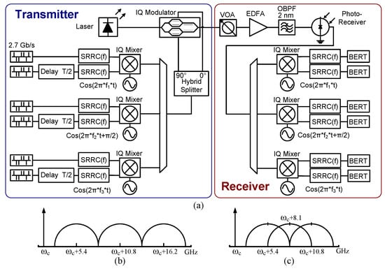 (a) Direct Detection (DD) electro-optical scheme compatible with subcarrier multiplexing (SCM)/single side band (SSB) and orthogonal subcarrier multiplexing (OSCM)/SSB transmission based on optical IQ modulator and pre-amplified optical receiver; (b) example of transmitted optical spectrum for the case of SCM/SSB consisting of three 2.7 Gbaud quadrature phase shift keying (QPSK) subchannels; (c) example of transmitted optical spectrum for the case of OSCM/SSB consisting of three orthogonally overlapping 2.7 Gbaud QPSK subchannels.