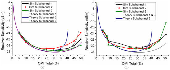 The mathematical model was developed for the non-overlapping SCM case. However, as the OSCM eye diagrams also present an ideal sampling point in the middle of the bit period [13], which is impaired only by noise and distortion, the mathematical model can also be applied to OSCM. A perfect compatibility of the model with OSCM is expected when the optical noise is completely dominant over IMD and determines the final sensitivity. In other cases, as any intermodulation product also distorts the adjacent subchannels, higher deviations between the VPI simulation and theory are expected. This effect can be observed in Figure 2b. In this case, even for low values of OMI (M% ≤ 35%), the error is higher than in the previous case, ≤4 dB. However, similarly to the previous case, the optimum OMI for each subchannel is predicted with a negligible error (M% ≈ 25% for Subchannel 2 and M% ≈ 35% for Subchannels 1 and 3).