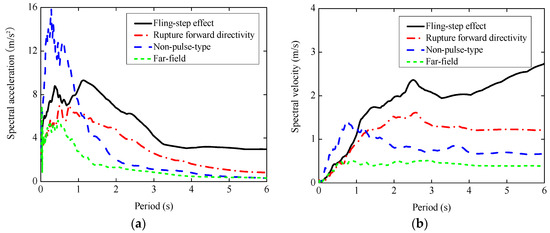 Average acceleration and velocity response spectra for different types of earthquakes: (a) spectra acceleration; and (b) spectra velocity.