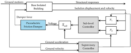 where is the inertial force applied to the mass; is the restoring force provided by the isolation bearing; is the mass of the superstructure; and are the mass and stiffness of the base isolator, respectively; and is the displacement of the base isolator. The parameters , , and of the piezoelectric friction damper are set to 2500 N, 2.5 N/V, 0.4 and 1000 V, respectively.