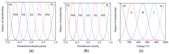 Input and output membership functions for sub-level fuzzy controller: (a) input normalized displacement; (b) input normalized velocity; and (c) output voltage.