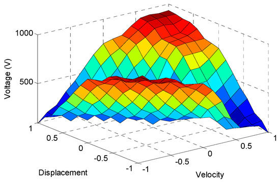 After the fuzzification of the input and output variables, fuzzy control rules were established for the sub-level FLC, as shown in Table 3. The control rules are in the form of if-then rules and map the links between the input and output membership functions. The control principles are as follows: (1) if the base displacement and velocity have opposite signs (i.e., the isolation system returns to its original position), then the output voltage becomes small in order to ensure the PFD output small damping force; and (2) if the base displacement and velocity have the same sign, then the output voltage becomes large. At the same time, the magnitude of the output is linearly proportional to the magnitude of the input variables. When the displacement and velocity are almost zero or small, the command voltage is about zero, which means that PFD acts as a passive Coulomb damper. The defuzzification of fuzzy control employs the method of centroid to get a crisp output value. The control surface for the sub-level FLC is shown in Figure 6.