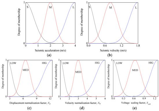 Input and output membership functions for supervisory FLC: (a) input seismic acceleration; (b) input seismic velocity; (c) output displacement normalization factor; (d) output velocity normalization factor; and (e) output voltage scaling factor.