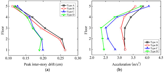 Average peak inter-story drift and floor acceleration of controlled base-isolated structure subjected to earthquakes: (a) average peak inter-story drift; and (b) average peak floor acceleration.