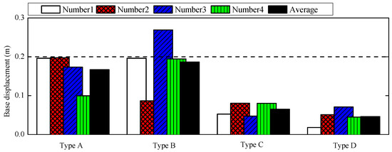 To explore the influence of pulse-type near-fault earthquakes on base displacements, the peak base displacements of SHFLC isolated structure under four types of earthquakes are shown in Figure 9. It can be seen from this figure that the peak base displacements of SHFLC isolated structure are less than 0.2 m for most of the pulse-type near-fault earthquakes. For the two types of near-fault earthquakes with the fling-step effect and the rupture forward directivity, the average peak base displacement is 0.167 m and 0.187 m, respectively. However, the base displacement decreased was evident when subjected to non-pulse-type near-fault and far field earthquakes, with the average peak base displacements equal to 0.065 m and 0.046 m, respectively. It can be concluded that pulse-type near-fault earthquakes can lead to much larger responses for SHFLC isolated structure as compared to non-pulse-type near fault earthquake and far-field earthquake, especially in the isolation layer and the bottom of the superstructure.