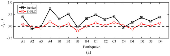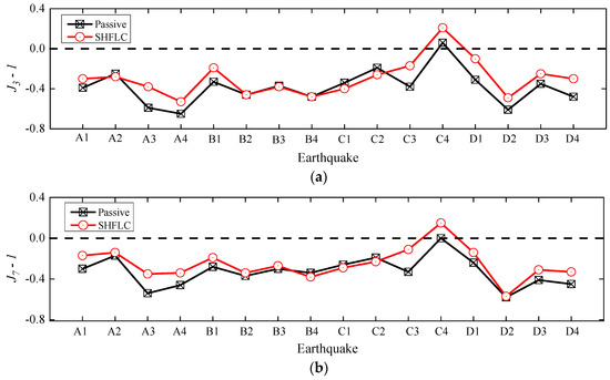Performance indices and for different control cases under various types of earthquakes: (a) Performance index ; and (b) Performance index .
