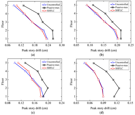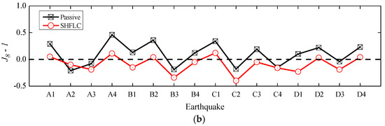 Figure 12 illustrates the profiles of average inter-story drifts for uncontrolled, maximum passive control and SHFLC cases. In the figure, it can be seen that the SHFLC case is better than the maximum passive control in inter-story drift reductions of base-isolated structure. Compared with uncontrolled base-isolated structure, there is no obvious amplification in inter-story drifts in the SHFLC case. Furthermore, the inter-story drifts of the SHFLC case at the bottom of the superstructure have an appropriate reduction, which can be illustrated by the performance indices shown in Table 7 and Table 8, respectively. The values of for the SHFLC case subjected to most earthquakes is less than 1, which demonstrates that the peak inter-story drift of the SHFLC case is reduced relative to uncontrolled structure.