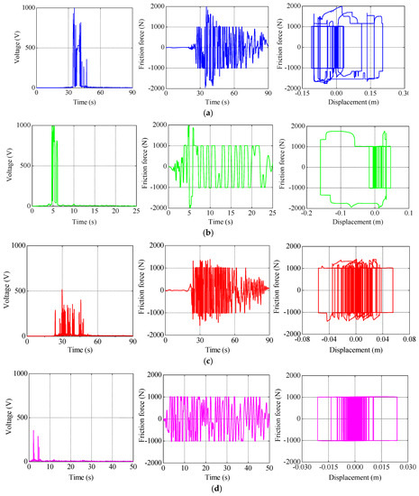 In order to further evaluate the adaptability of the proposed SHFLC control strategy under different types of earthquakes, the command voltage time history, the damping force time history and the force–displacement curve of the PFD with the SHFLC control strategy are shown in Figure 13, for different earthquake records. As seen in Figure 13, under the pulse-type near-fault earthquakes, such as the TCU068-NS record of the Chi-Chi earthquake with fling effect and the WPI-316 record of the Northridge earthquake with rupture forward directivity, the SHFLC method can output the full amplitude voltage in real time when subjected to large pulse earthquakes. In these cases, large structural responses will be produced and the PFD will output large damping forces to control the base displacement. Therefore, the large output command voltage of the controller will lead to many irregular serrations in the force–displacement curve of the PFD.