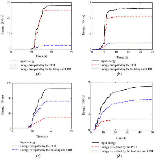 where , , , , and denote the absolute kinetic energy, the damping energy, the elastic strain energy, the hysteretic energy provided by the PFD, and the absolute input energy, respectively.
