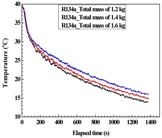 By using the refrigerant charge matching method for the cooling system as mentioned in Lee et al. [21], the refrigerant charge of the designed air conditioning system for a special purpose vehicle was set to 1200 g at an outdoor temperature of 40.0 °C and an indoor temperature of 40.0 °C. The compressor speed was set to 2700 rev/min because the cooling speed of the air conditioning system with two parallel refrigeration cycles for the special purpose vehicle at the refrigerant charge amount of 1200 g was superior to other cases, as shown in Figure 4. The indoor temperature of the air conditioning system with the two parallel refrigeration cycle for a special purpose vehicle at the refrigerant charge amount of 1200 g just reached the target temperature 25.0 °C within the elapsed time of 300 s. At the elapsed time of 300 s, the indoor temperatures of the suggested air conditioning system at the refrigerant charge amounts of 1200 g, 1400 g, and 1600 g were 24.7 °C, 25.2 °C, and 26.4 °C, respectively. This cooling time of 300 s for the indoor temperature of 25.0 °C was required for customer satisfaction. In addition, with respect to the time required for the indoor temperatures of the suggested air conditioning system to reach 15.0 °C, the time taken increased by 13.3% when the refrigerant charge amount was decreased from 1600 g to 1200 g. Figure 4 shows the cooling speeds of the air conditioning system with two parallel refrigeration cycles for the special purpose vehicle with the change of refrigerant charge amounts from 1200 g to 1600 g.