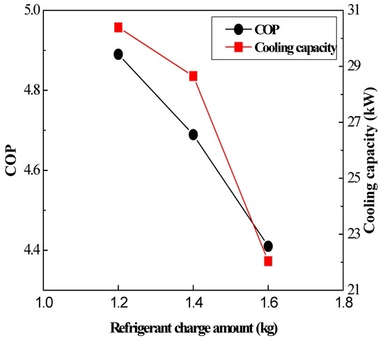 Figure 5 shows the cooling capacity and COP of the air conditioning system with two parallel refrigeration cycles for the special purpose vehicle with the change of refrigerant charge amounts from 1200 g to 1600 g. The cooling capacity and the COP of the suggested air conditioning system increased by 37.9% and 10.9%, respectively, with the decrease of the refrigerant charge amount from 1600 g to 1200 g because of the decreased power consumption of the compressor with the decreased of the refrigerant charge amounts. Based on the results of Figure 4 and Figure 5, the suggested air conditioning system with two parallel refrigeration cycles for the special purpose vehicle was normally operated initially to meet the required cooling capacity of 21.0 kW regardless of the amount of refrigerant, due to the large difference between the refrigerant evaporating temperature and initial inner temperature. However, with respect to the cooling time to be reached at the indoor temperature of 25.0 °C within 300 s and the target indoor temperature of 15.0 °C, the designed air conditioning system with the two parallel refrigeration cycles for a special purpose vehicle was optimized at the refrigerant charge amount of 1200 g and satisfied the requirement of the fast cooling speed for the customers. Therefore, the performance of the designed air conditioning system for a special purpose vehicle showed that it could be used as an air conditioning system for the cabin cooling of a special purpose vehicle used under the warmer weather conditions of Southeast Asia.