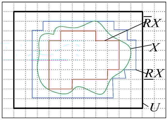 In general, Figure 1 represents the upper approximation and lower approximation. The area in the black box is the domain , the area in the green curve denotes , the inner red curve denotes the upper approximation set , and the blue curve denotes the lower approximation set .