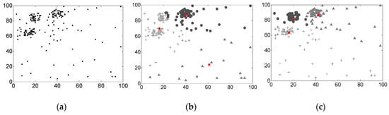 Comparison of clustering effects of two methods, they are listed as: (a) datasets; (b) clustering effect using the traditional FCM algorithm; (c) clustering effect using the improved FCM algorithm.