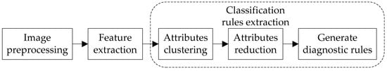 A flow chart of attribute reduction using the rough sets algorithm is shown in Figure 8. The rough sets theory was used for attribute reduction of the data in Table 3. We then used the Johnson algorithm [] to obtain the core of conditional attributes as {coarseness, contrast, line-likeness, regularity}. This showed that for decision attributes, these four attributes were sufficient to maintain the classification ability of the information system. By sorting the reduced decision table, the rules of precision >0.75 and coverage >0.05 were selected []. Finally, the typical diagnostic rule table is shown in Table 4. Using the rough sets theory effectively explored the potential laws of knowledge by simplifying unnecessary attributes, and we could extract the most concise and accurate classification rules in pattern recognition.