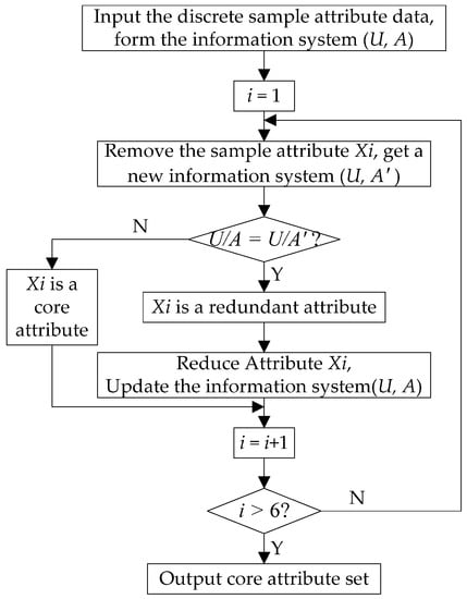 Based on the classification mechanism, the rough sets theory’s research object is the information system []. By introducing an indiscernibility relation as the theoretical basis, and defining the concepts of upper and lower approximations, the rough sets theory focuses on knowledge reduction and determining attribute importance. Through attribute reduction, the fuzziness and uncertainty knowledge can be described by the knowledge in the existing knowledge base.