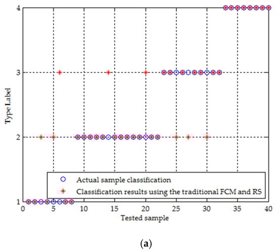 From the Figure 9, it can be seen that 32 cases in the 40 samples were classified to the correct classification using the traditional FCM and rough sets, and the recognition rate was only 80% because the clustering process was affected by isolated points and the clustering centers were randomly selected. The improved FCM algorithm overcame the defects of the traditional FCM, which is sensitive to initial clustering and is susceptible to isolated points, and produced higher quality clustering results. Attribute reduction preserved more accurate classification information, and thus formed clearer and simpler classification rules. Our proposed method successfully classified 39 of 40 samples, with a recognition rate as high as 97.5%.
