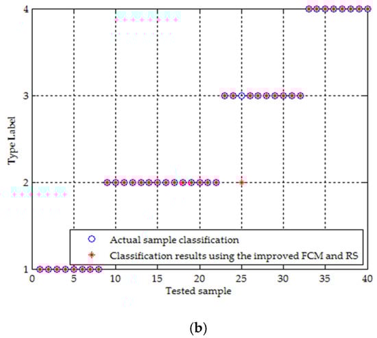 Comparison of classification results of the two methods, which are listed as: (a) classification result using the traditional FCM and rough sets (RS); (b) classification result using the improved FCM and rough sets (RS).