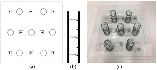 A schematic of the lateral damping buffer is shown in Figure 1. Two pieces of board are connected by springs, acting together as a cushion to the impact. In addition, eight boxes with eight particles uniformly adhere to one of the boards, whose main function is to enlarge the damping as energy-dissipating dampers. Meanwhile, the diameter of the particles is 12 mm, and each particle weighs 7 g. The size of the boxes is 25 mm × 25 mm × 18 mm, and each one weighs 6 g.