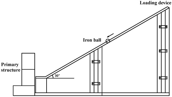 A test site is designed according to the situation when debris flows break through and the test operability, shown in Figure 3. The loading device includes a slope with an angle of 30° on the horizontal plane and a fixed mount. Referring to other experts’ experience, the load of debris flows is simulated by an impact force caused by a ball rolling down from a slope [33,34,35]. There is one accelerometer placed at the top of the test model to record the structural response.