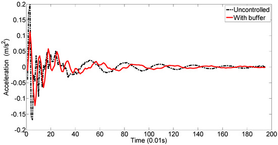 As introduced in Section 2, a lateral damping buffer can be regarded as a combination of a buffer and a shock absorber. Meanwhile, the element of the buffer functions in a remarkably short period of time, mainly in the vicinity of the moment of impact. Specifically, the peak value of the acceleration of the controlled structure is reduced greatly compared to the uncontrolled structure. In this limited timespan, the shock absorber has not come into action yet because the increase of the damping coefficient by the collision of the boxes and particle takes time. Then, after impact, the portion of the shock absorber functions step by step and reduces the subsequent vibration of the primary structure gradually. In summary, the two roles of the lateral damping buffer take effect in different periods of time: the buffer portion works in a short time in the vicinity of the impact, while the shock absorber portion works mainly in the process of the structural vibration after impact. Consequently, the effectiveness of the two parts can be considered respectively.