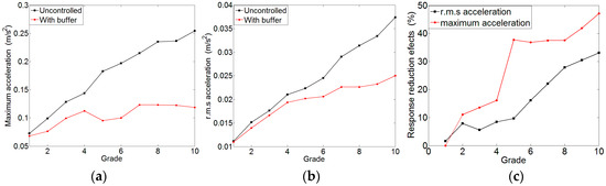 Acceleration response and the reduction efficiency: (a) Maximum acceleration; (b) Root mean square (r.m.s) acceleration; (c) Response reduction effects.
