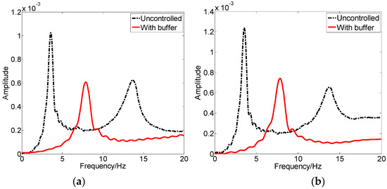 Figure 6 shows the responses of the uncontrolled structure and the structure with buffer in the frequency domain under the loading cases of grade 4 and grade 6.