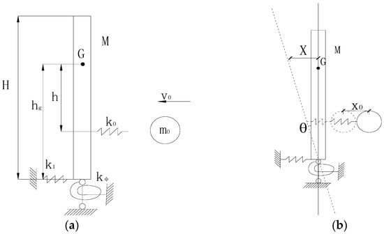 In the system shown in Figure 7, m0 and M represent the impact ball and the primary structure respectively, denote the stiffness of the contact spring, the lateral bracing rigidity and the anti-rotation stiffness of the structure respectively, stand for the total height of the structure, the height of the center of gravity from the bottom of the structure and the difference of height between the center of gravity and the contact spring respectively, and J means inertia rotation.