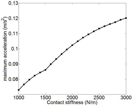 To study the influence of contact stiffness on the effectiveness of the lateral damping buffer, the response of the primary structure can be calculated by the methods above with different contact stiffness. The initial velocity is taken as the velocity in grade 5, and the contact stiffness ranges from 1000 to 3000 . Then, the peak values of the structural response (as shown in Figure 10) are calculated by the methods mentioned in Section 4.1.
