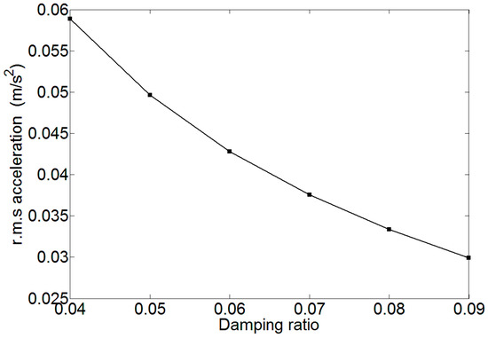 To study the influence of the damping ratio, the response of the primary structure can be calculated by methods illustrated in Section 4.2 with different damping ratios. The initial velocity and initial acceleration are taken as the velocity and acceleration in grade 5, and the damping ratio is taken as ξ = 0.04, 0.05, 0.06, 0.07, 0.08, and 0.09. Then, the root mean square accelerations (as shown in Figure 11) are calculated by the methods in Section 4.2.