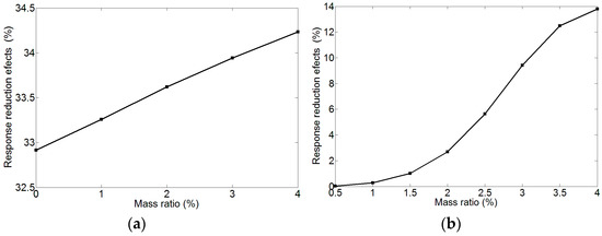 To study the influence of the mass ratio (the ratio of total auxiliary mass, including the boards, springs, particles and boxes, to the mass of test model), we can calculate the response of the structure by the methods in Section 4.1 and Section 4.2 with different mass ratios. The mass ratio is different from the previous two parameters in that it affects both the structural response in two phases. Therefore, the analysis of this parameter can be considered from the two aspects of peak acceleration and root mean square acceleration, respectively. The initial velocity and initial acceleration are taken as the velocity and acceleration in grade 5, and the mass ratio ranges from 1.0% to 4.0%. Then, the response reduction effects of the peak acceleration and the root mean square acceleration (as shown in Figure 12) are calculated by the methods in Section 4.1 and Section 4.2.