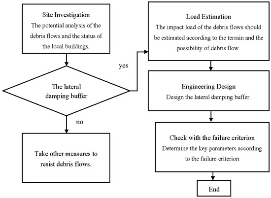 According to the mechanisms and parametric study of the lateral damping buffer, the design process of such a buffer in resisting the debris flows is proposed, as shown in Figure 13.
