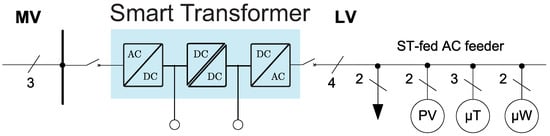 The smart transformer proposed in this work is a three-stage power electronics transformer [5,20]. The ST adapts the voltage between the MV to the LV grid, and enables the DC grid connections at both voltage levels [21]. A reference system is shown in Figure 1. Several topology solutions can be implemented for each stage, although the control strategies do not differ substantially. The ST control strategy adopted in this work is shown in Figure 2.