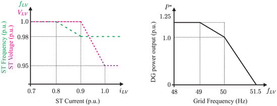 In the controllable resources, a droop controller curve is implemented as shown in Figure 3. The interface converter decreases its power output until shut down in the case of high frequency ( Hz) [22] and increases its power injection up to 125% in the case of frequency decrease (49 Hz). Implementing such droop controller, the interface converter can interact with the ST under frequency variation signals. The frequency threshold values chosen for this work respects what asked in the Italian standard [22]. The DG converter must remain connected to the grid within the frequency range (–) Hz. In case of over-frequency, the DG must reduce the power output from nominal power ( Hz) to zero power ( Hz). It is worth mentioning that this controller does not affect MV and high voltage (HV) grids. The ST is a three-stage power electronics-based transformer with two DC links. This enables an AC power flow separation between the LV and MV grids; thus, the frequency change in the LV grid is independent from the MV grid frequency.