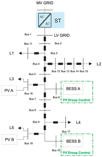 The simulations are carried out implementing a modified CIGRE European LV distribution network benchmark [23] (Figure 4) in PSCAD/EMTDCTM v46. The assumptions made in this work are as follows: (1) the loads are balanced three-phase; (2) the distributed resources, such as Battery Energy Storage Systems (BESS) and PV are working with unity power factor; (3) the wind turbine has been removed; (4) the loads are assumed as constant impedance by means of an exponential load model. The load and ST data are listed in Table 1. The battery energy systems and the photovoltaic power plants are controlled by means of an external power loop that gives the reference current to a current loop. The nominal data of the batteries and PV are listed in in Table 2. The energy resource models are tuned following the standard procedures for renewable converters described in [24].