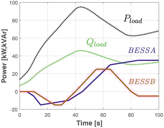BESS A active power (blue line), BESS B active power (red line), sum of load active power (dotted black line), sum of load reactive power (dotted green line).