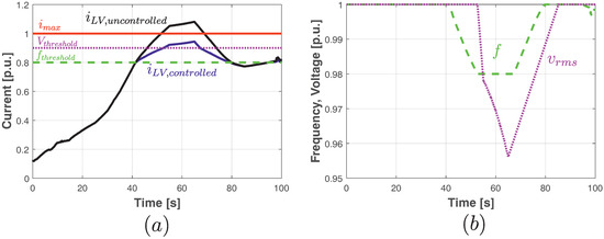 The frequency controller is activated when the current goes above the 80% threshold and the voltage controller follows at 90% of the nominal current. In Figure 6a, the current profile in absence of overload control is plotted (black line). As can be noted, without control, the current exceeds the current maximum limit for more than 20 s in the considered time window. This may lead to damages to power semiconductor and reduction of the ST expected lifetime.