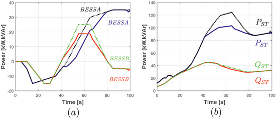 The batteries’ power profiles are shown in Figure 7a. The batteries increase the power output when the frequency is modified due to the droop controller action (solid lines) with respect to the base case (dotted lines). The effectiveness of the combined action of frequency and voltage controllers can be observed in the ST power profiles in Figure 7b. Without control, the active power alone exceeds the ST size (dotted black line). Applying the ST overload control, both active and reactive power are reduced (continuous lines).