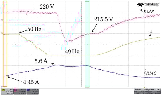 The maximum current has been set to 6 , and the frequency and voltage controller threshold have been set to 80% and 90%, respectively. The voltage controller ramp limiter has been set equal to V/s. The variable resistor has been operated from 28 Ω to 21 Ω for about 20 s. In Figure 9 the operations of the overload controller have been plotted. As soon as the ST current exceeds the A threshold, the frequency controller is activated, and it decreases the frequency from 50 Hz to 49 Hz. When the current increases above A the voltage is decreased, limiting the ST overload to A, with a further margin for load increase. The voltage drops from 220 V to V during the steady state condition. As soon as the variable resistance increases, the ST current decreases, and the voltage and frequency are slowly restored to the nominal value. A better understanding of the overload controller operations can be obtained looking at Figure 10 and Figure 11. These figures represent the steady-state waveforms before the overload condition and during the controller operation, marked respectively with the orange and green boxes in Figure 9. In Figure 10, the ST controls the voltage waveform at the nominal amplitude and frequency, being the ST current lower than the frequency controller threshold. The DG current amounts to 4 and the load absorbing about . As soon as the load increases, the overload controller acts on the voltage amplitude and frequency values. The steady-state behavior during the controller operations (Figure 9, green box) is shown in Figure 11. The ST decreases the voltage amplitude and frequency, and the DG is able to recognize the frequency change and increase the current output up to 5 . The load current consumption is maintained at by the voltage controller, instead to increase to . Both frequency and voltage controllers are able to avoid the ST overload.