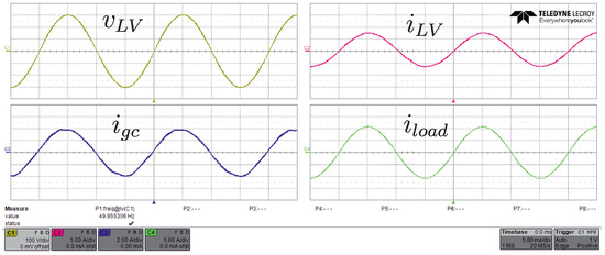 The LV side controls the LV grid voltage waveform. It provides symmetrical voltage waveforms with constant amplitude and frequency, independently from the load power request. The current amplitude and shape is instead decided solely by the load. In this work, the voltage waveform reference is given by the overload controller (Figure 2, red box), explained in the next section.