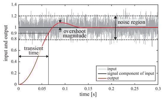 where is the unit white Gaussian noise with zero mean, and α is a normalized noise-scaling constant. Here, as shown in Figure 3, the transient time is defined as the time required for the output to reach 90 % of the signal component of the input, i.e., the input amplitude with . In addition, the overshoot magnitude is defined as the maximum amount of the output that measured upward from the signal component of the input.