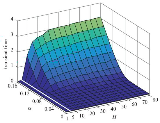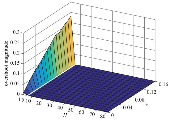 Figure 4 and Figure 5 show the transient time and the overshoot magnitude , respectively, under different values of H and α. In addition, Figure 6 provides cross-section view of Figure 4 and Figure 5 under . It is shown that the overshoot magnitude decreases as H increases, and it converges to a certain value in the range of . On the other hand, the increase of H results in longer transient time, which dramatically increases within the range of . Such tendencies become stronger as the value of α increases.