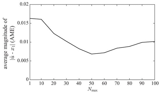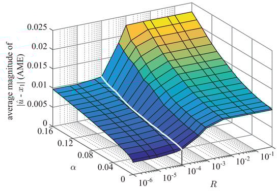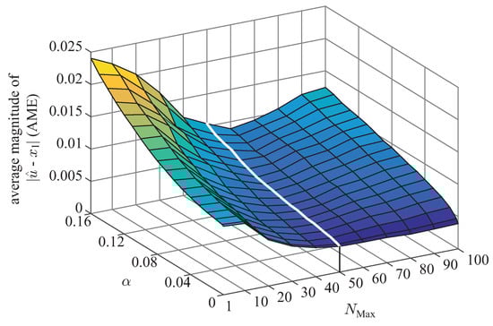 Figure 7 shows AME under different values of and α, and Figure 8 provides AME of Figure 7 under . One can observe that AME converges to its minimum value as reaches around under a certain value of α.