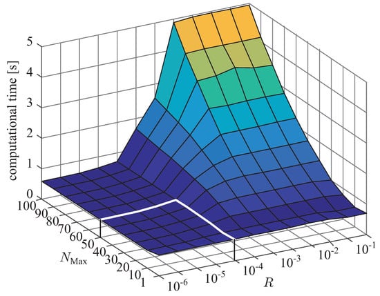 Figure 11 shows the computational time spent by AG-PSMF with the input (7) under different values of and R. It is shown that the influence R on the computational time is insignificant in the range . In this range, the computational time under is slightly less than that under , as shown in Figure 12. However, in the range , the computational time increases with either increase in or R.